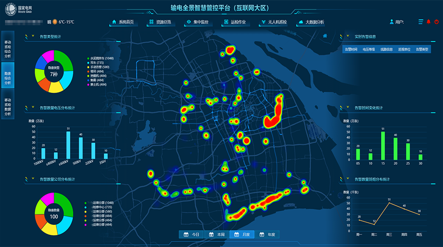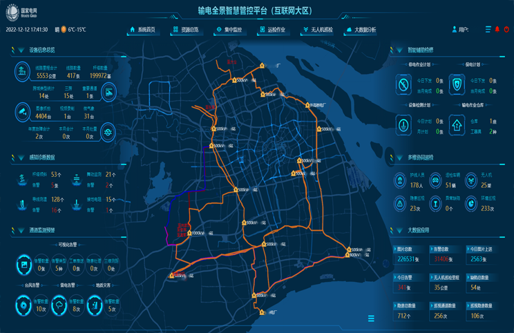 输电全景监控平台是以坚强输电线路为基础,以提升设备管理质效为目标,整合现有多维度专业系统,综合应用监测传感、信息通信、数据融合、人工智能等技术,实现数据管理全景化、运行状态透明化、诊断决策智慧化和设备修复高效化,具有本质坚强、实时感知、全息互联、自主预警、智能处置特征的监控平台。