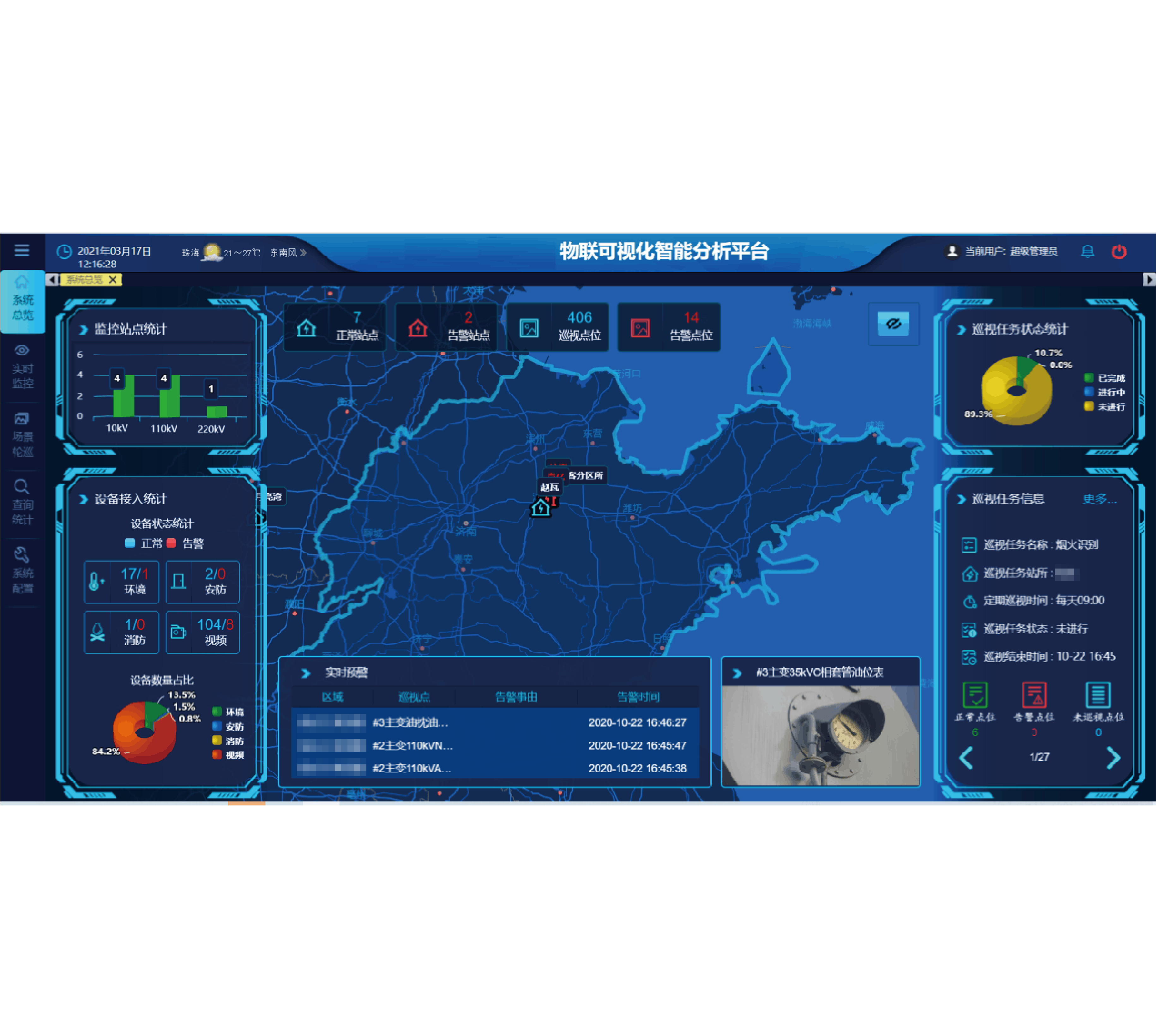 系统定期根据巡视路径、巡视规则、巡视计划调用各场景摄像机进行自动巡视,同时将巡视数据以报表形式推送给配电室值班人员,巡视过程中发现的异常,即时告警,将巡视工作由多天一巡提升为一天多巡。