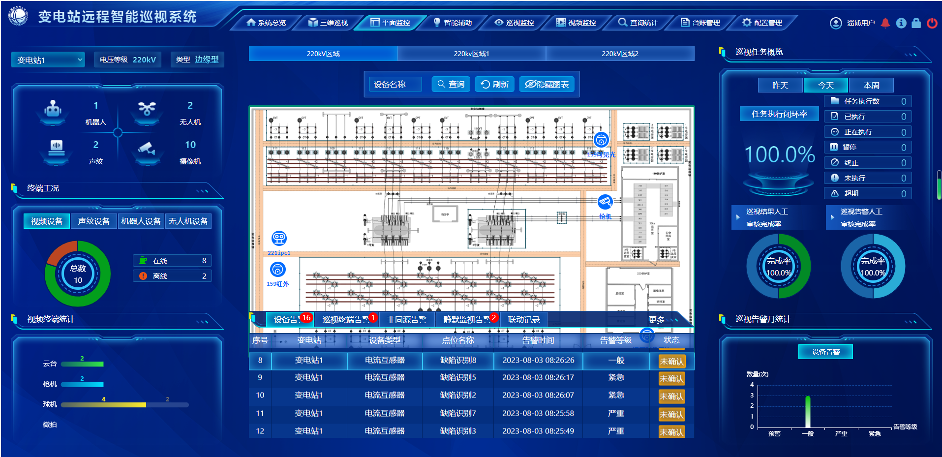 顺利获得人工智能技术的应用,实现可视化巡视图像的智能识别、自动分类、数据分析,配合自主巡视任务制定,实现例行巡视、特殊巡视、专项巡视、自定义巡视及静默监视,有效降低运维人员巡视工作量和巡视压力。