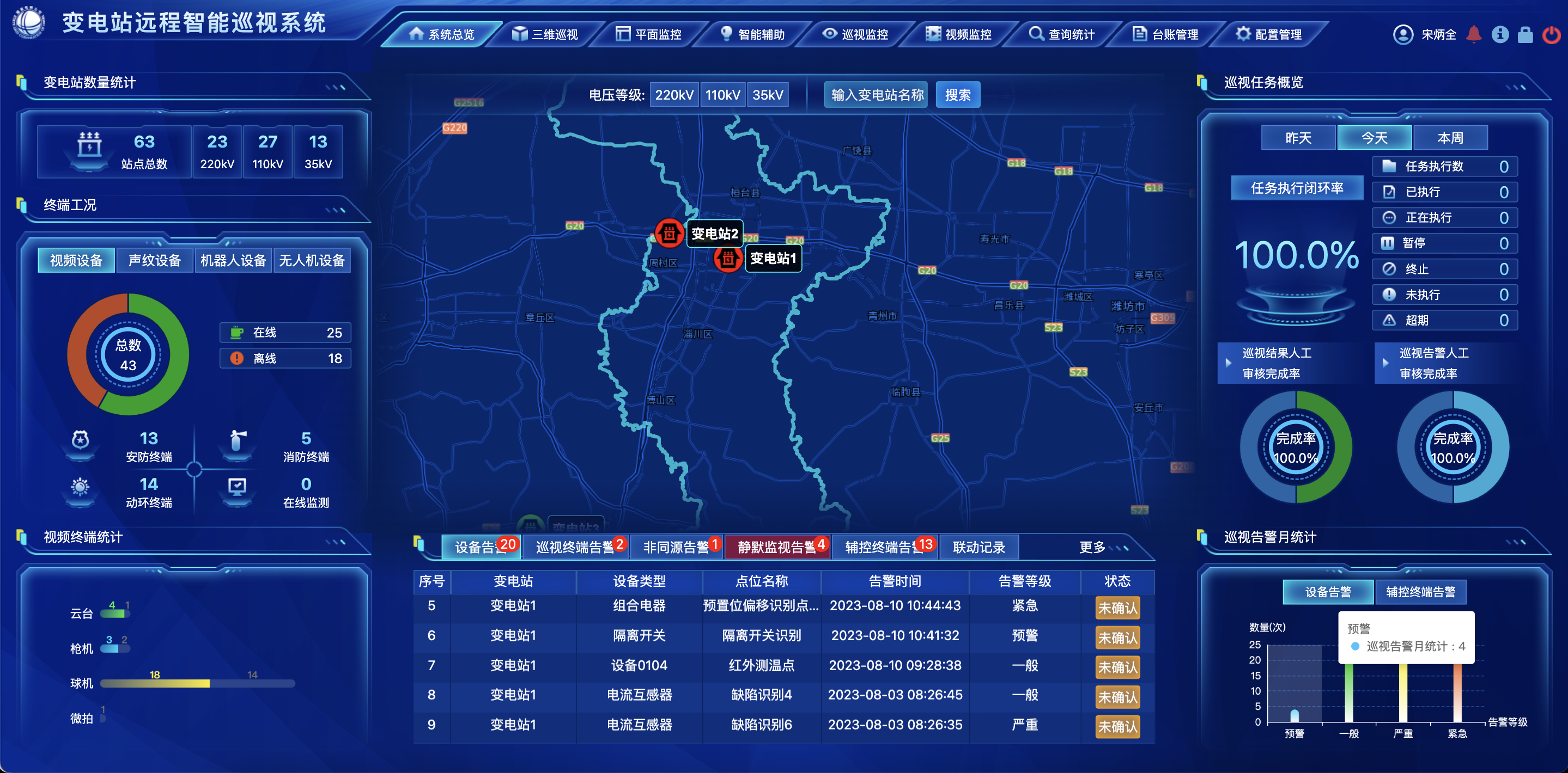 变电站远程智能巡视系统顺利获得各类高清摄像机和室内外巡检机器人对现场巡视点位进行抓图和视频录制,利用人工智能图像识别技术,对设备、人员、环境、缺陷等进行智能化分析判断,从而实现变电站的智能化远程巡视。